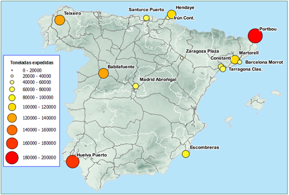 Las estaciones con mayor movimiento de mercancías peligrosas son Portbou, Huelva, Teixeiro y Babilafuente, como estaciones expedidoras, y Villalonquéjar, A Coruña, Barcelona Morrot-Contenedores y Barcelona Puerto, como receptoras.