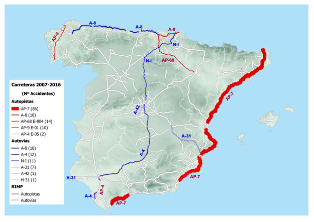 En estos tres años 2014-2016, la vía con más siniestralidad es la AP-7 en 10 accidentes.