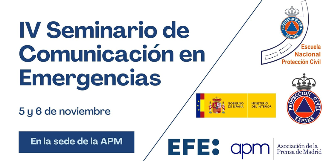 La Dirección General de Protección Civil, en colaboración con la Agencia EFE y la Asociación de la Prensa de Madrid (APM), organiza la cuarta edición del Seminario de Comunicación en Emergencias, que se desarrollará los días 5 y 6 de noviembre, en la sede de la APM.